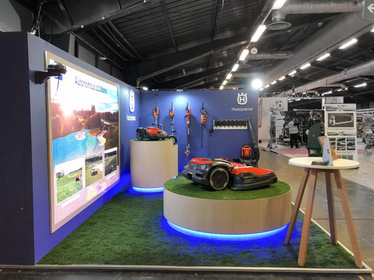 Once again, this booth design proves you don’t need to have a large exhibition space to stand out. Perfectly positioned logos resulted maximum visibility as soon as you entered the hall, even with relatively low walls. This, combined with a 3m x 2.5m LED screen, LED strip lighting and some splendid looking products ensured Husqvarna stood out next to their neighbours!