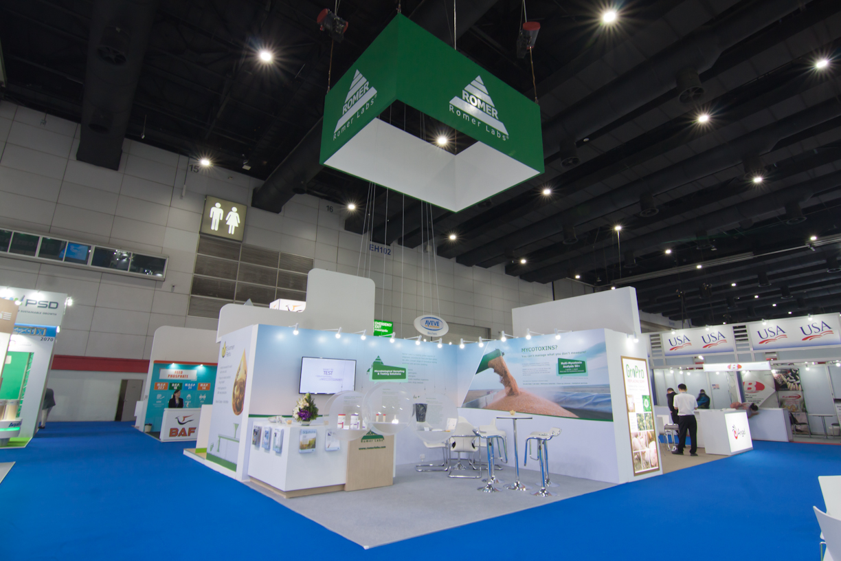 Romer Labs hired Fret Free Productions to design and build their stand at VIV. Our challenge was to provide maximum brand exposure within an 18sqm space. As the foot print was small, we decided to go upwards!
